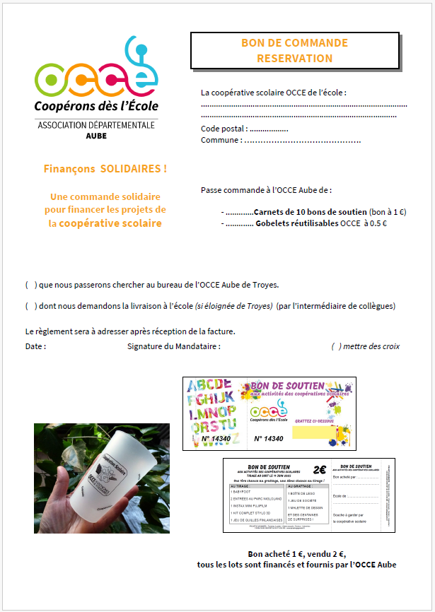 Pour vous aider à financer vos coopératives scolaires, nous vous proposons les gobelets OCCE et la souscription volontaire des bons de soutien.